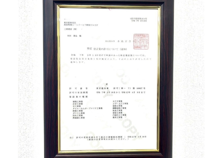 | 許可番号等 | 特定建設業東京都知事許可(特ー7)第160027号 宅地建物取引業東京都知事(1)第112015号 |